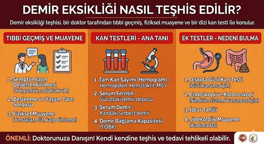 vücutta demir azlığı çoğu zaman fark edilmeden ilerler. Kesin tanı kan tahlili ile konur.