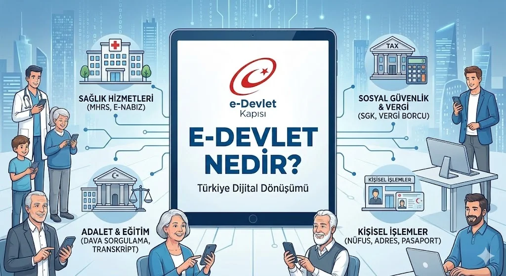 e-Devlet, vatandaşların kamu kurumlarına ait hizmetlere tek bir kullanıcı adı ve şifreyle erişmesini sağlayan resmi dijital platformdur. SGK, Nüfus, Adalet, Emniyet, Vergi, Eğitim ve daha birçok kurumun hizmeti e-Devlet üzerinden sunulur.